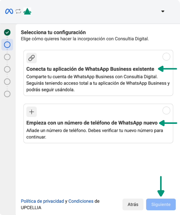 Elige si deseas conectar una cuenta de WhatsApp Business existente o un número nuevo.