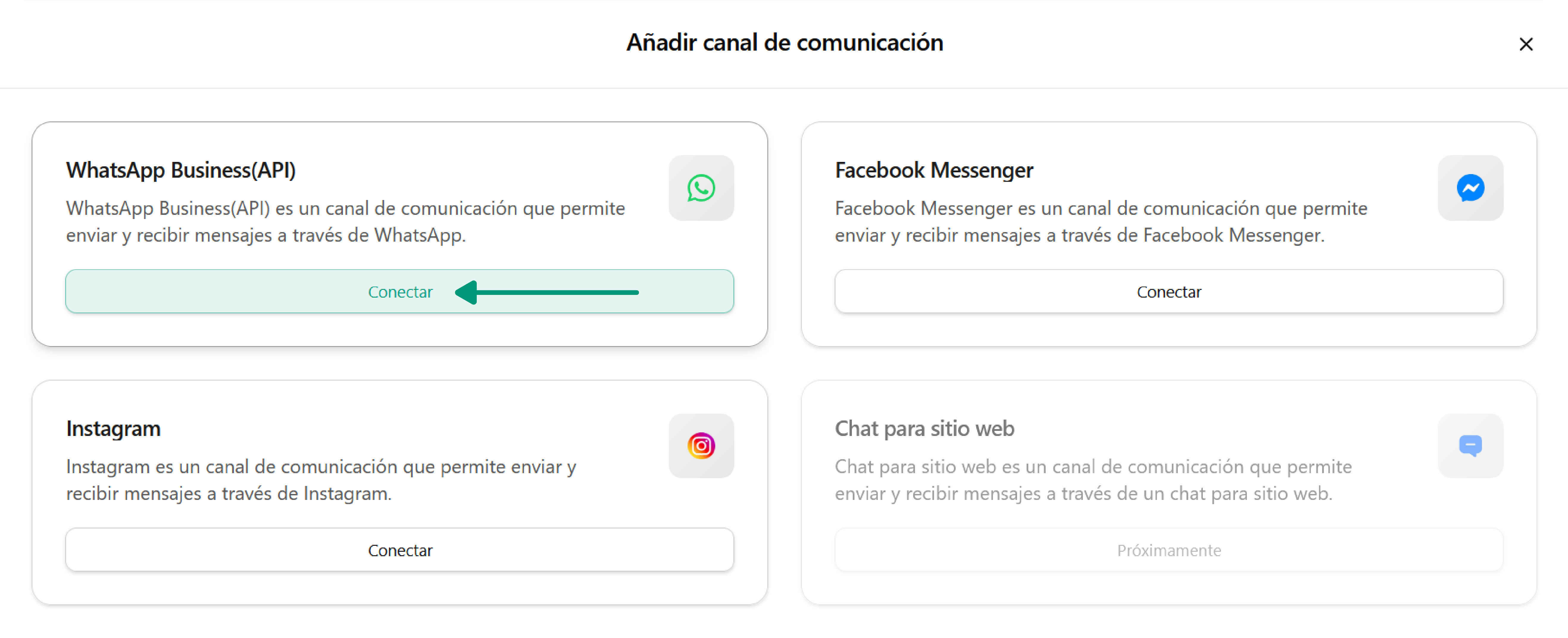 Haz clic en Añadir canal y elige Conectar WhatsApp.