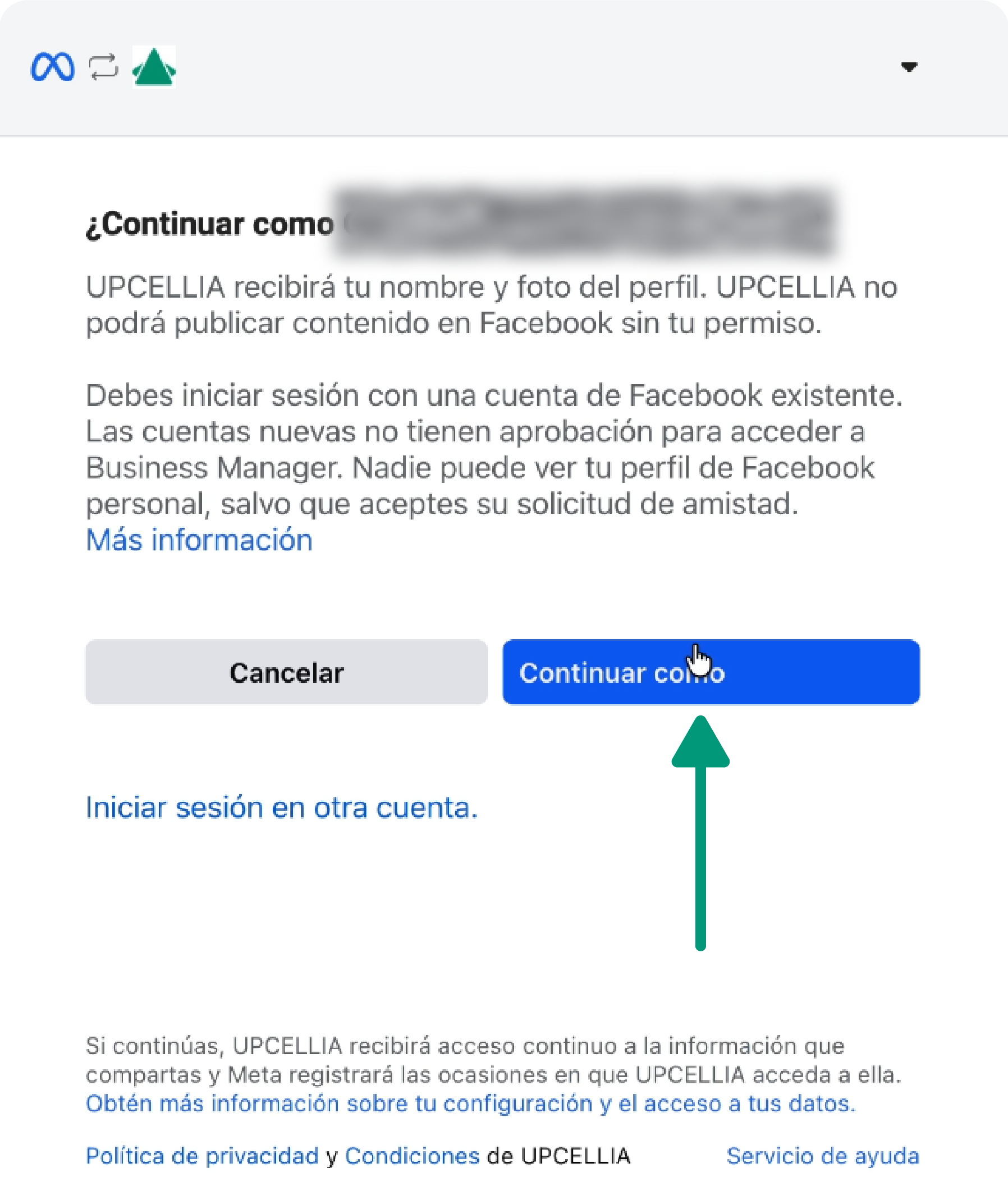 Pulsa Continuar con nuestra cuenta. En este paso, deberás otorgar los permisos necesarios para conectar tu cuenta con Consultia Digital.