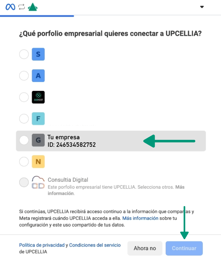 Elige el Portafolio empresarial que deseas conectar.