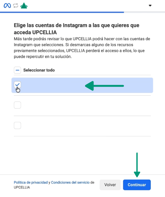 Selecciona la(s) cuenta(s) de Instagram que deseas conectar. La cantidad de cuentas disponibles dependerá de tu plan contratado.