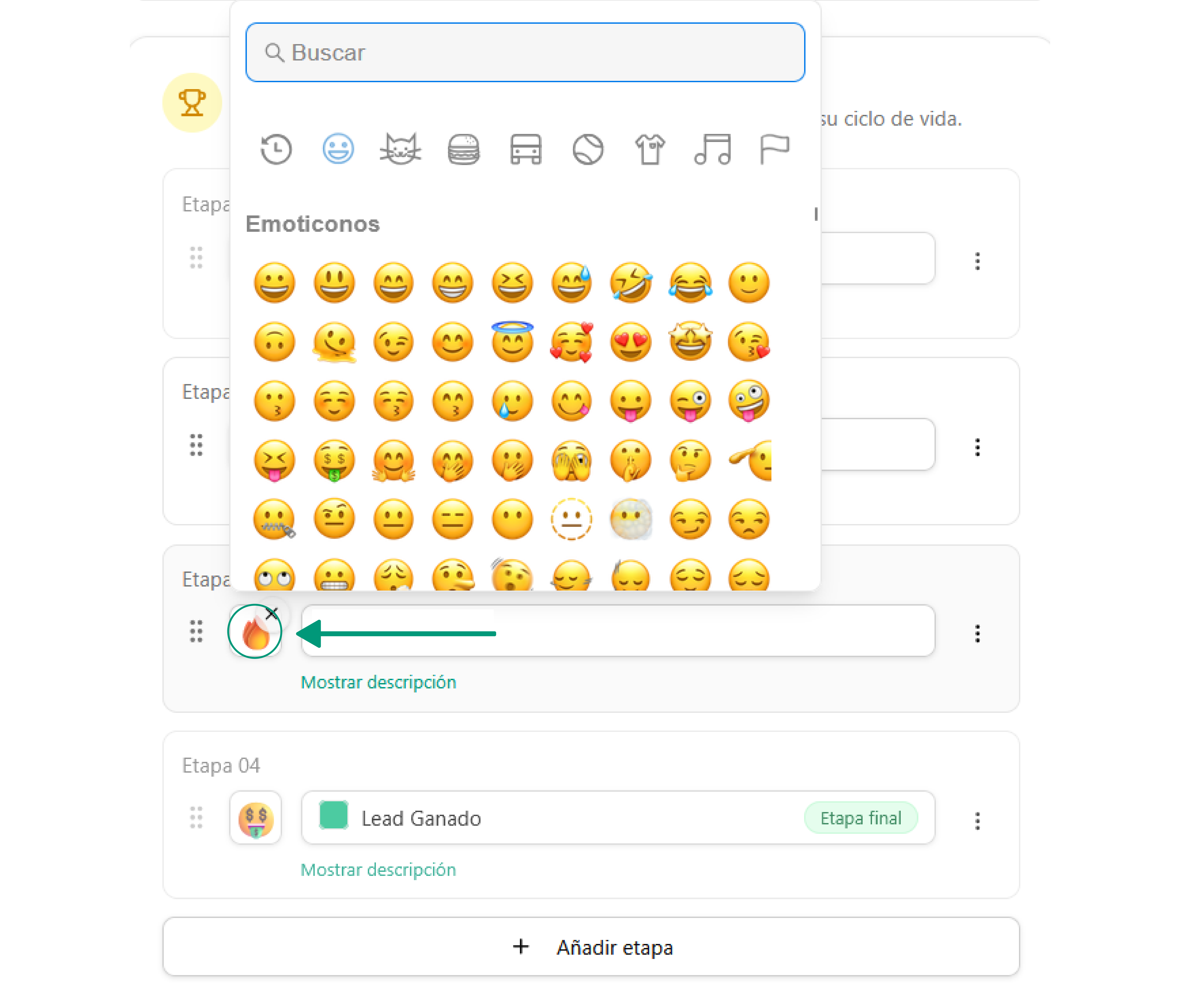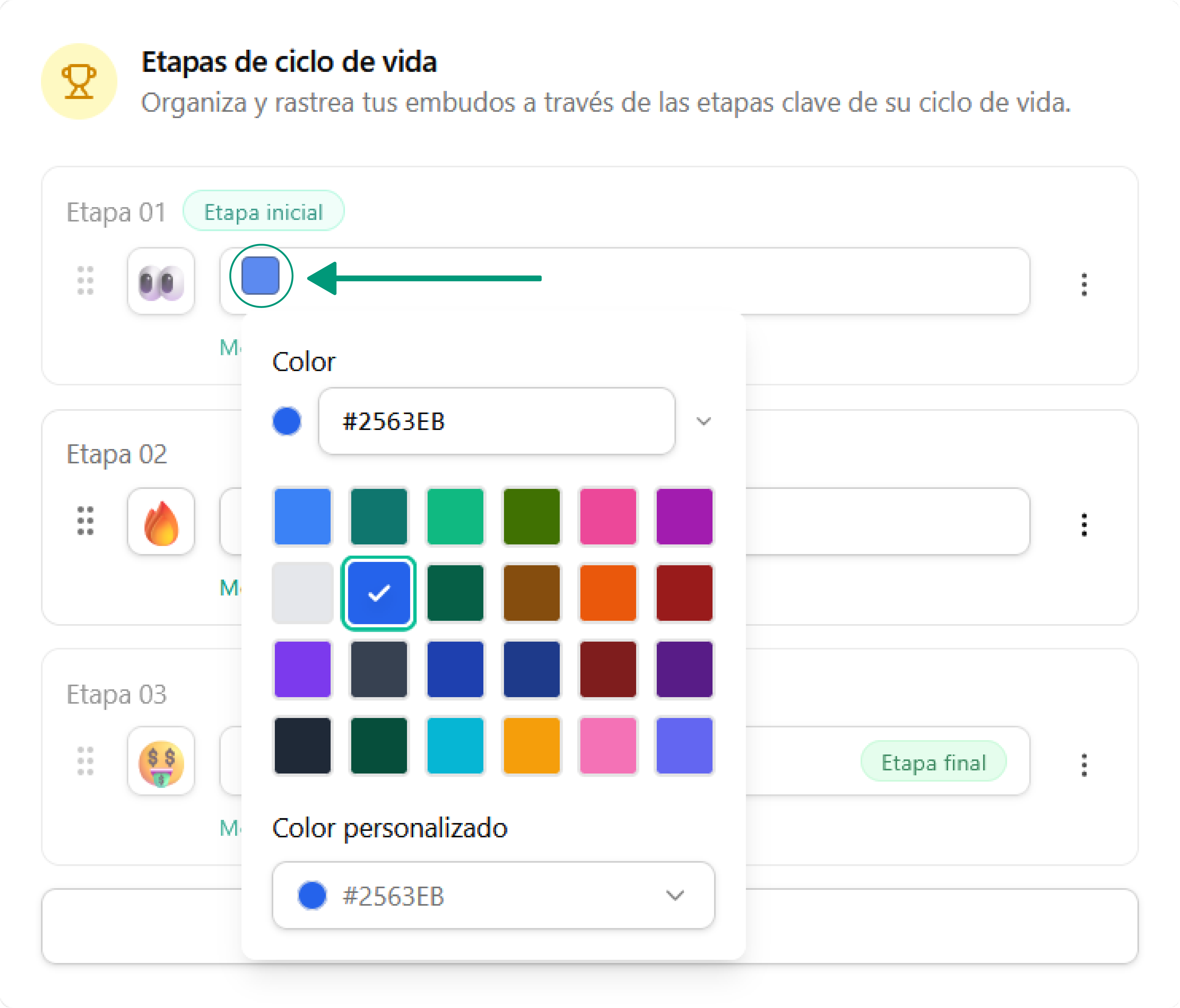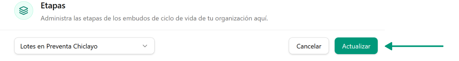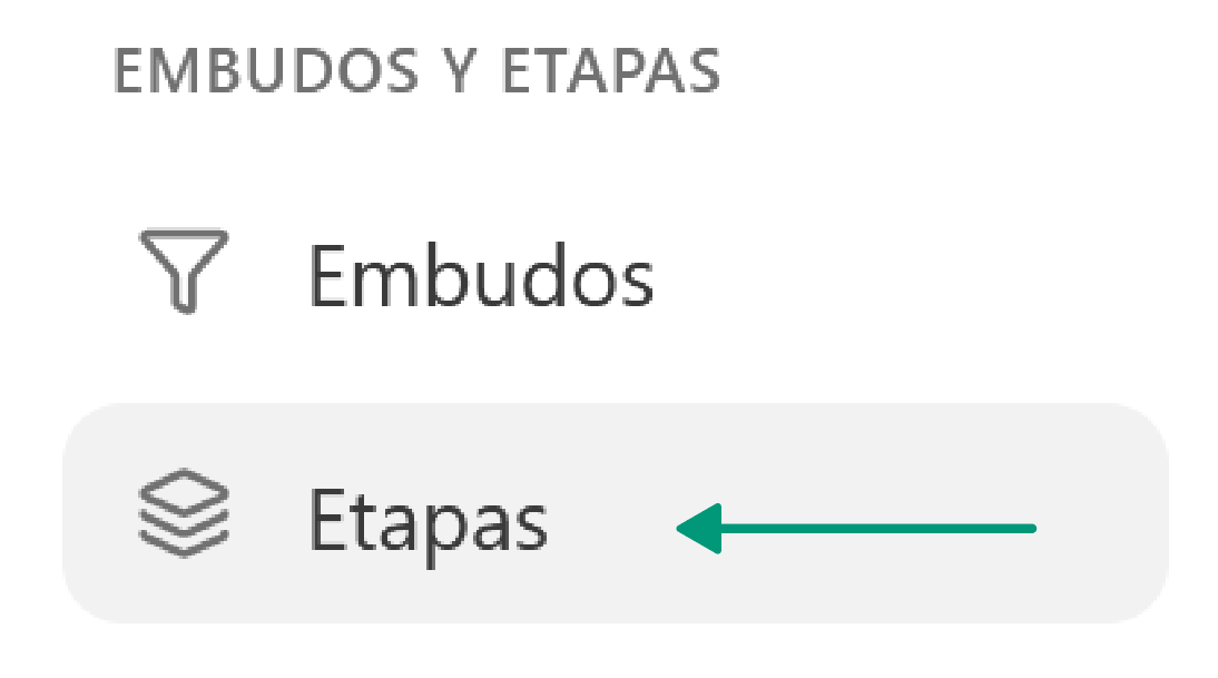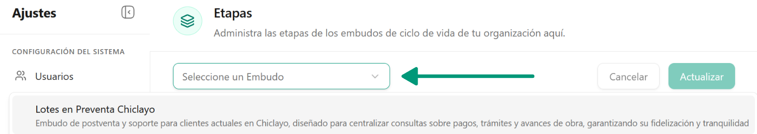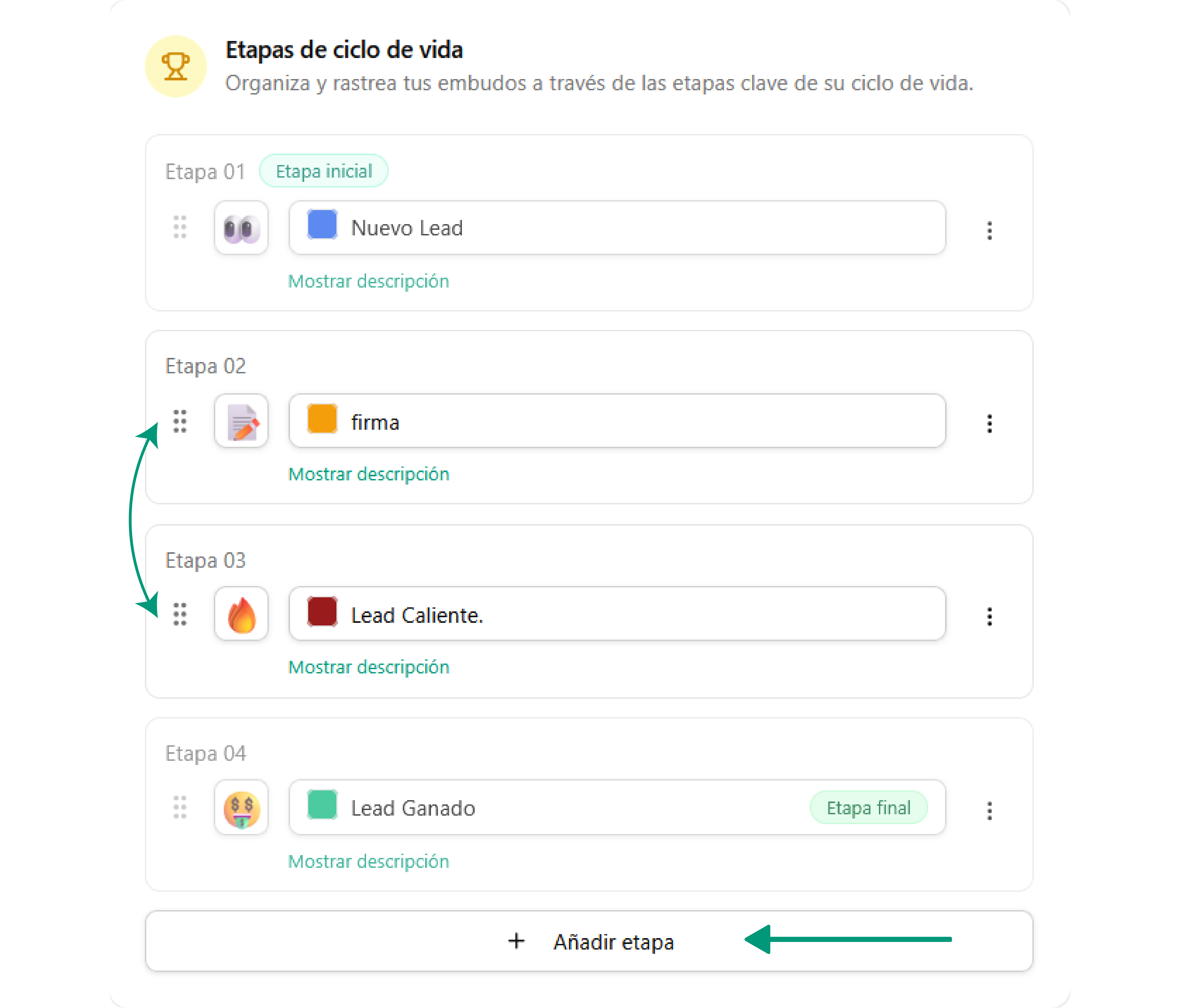 Una vez seleccionado el embudo, podrás personalizar sus etapas. Las opciones disponibles incluyen: